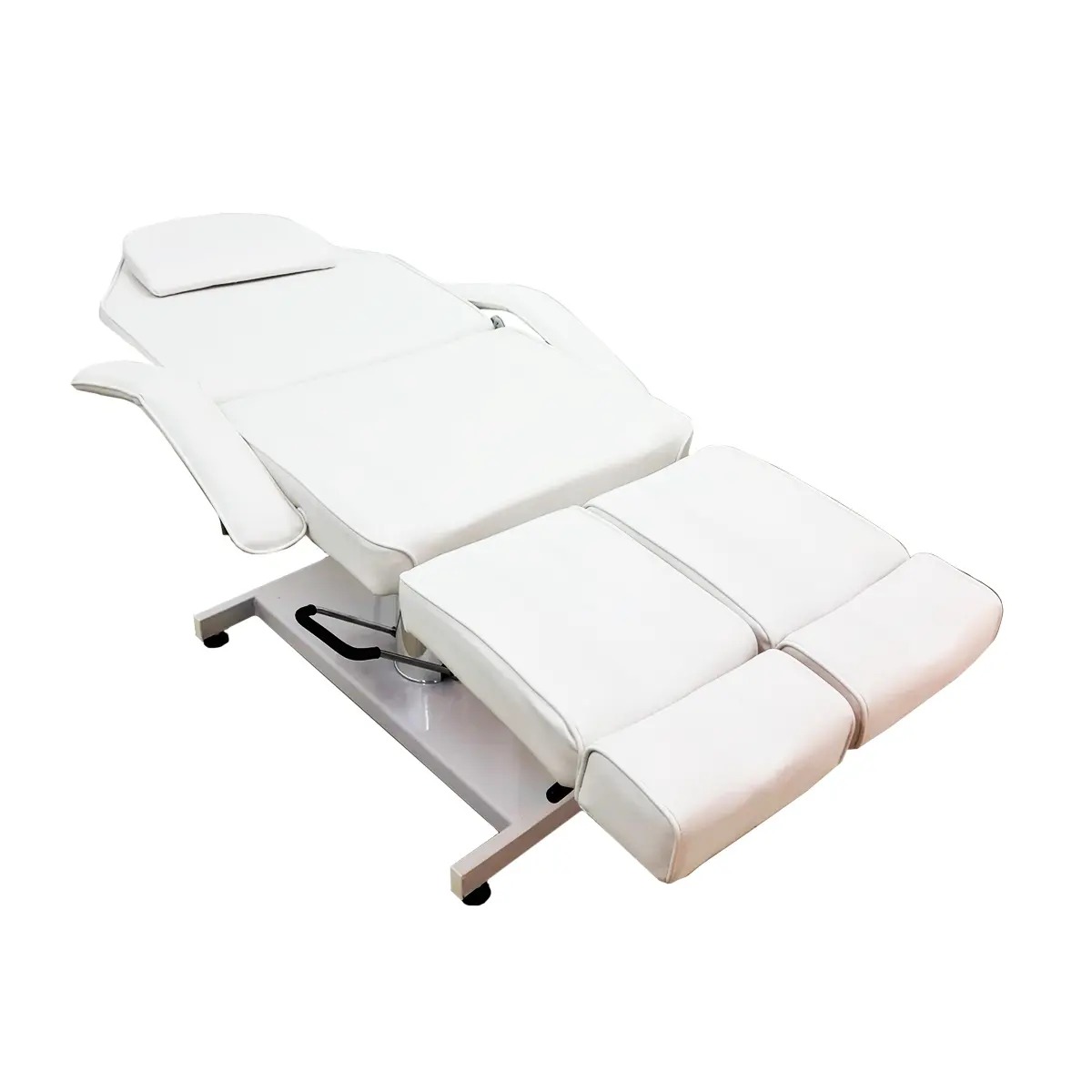 Com um sistema de reclinação completo, a cadeira permite ajustar individualmente o encosto e o apoio de pernas em diversos graus, incluindo abertura lateral controlada por um pistão de fácil manuseio. O assento é elevado por um robusto pistão hidráulico, garantindo suavidade e precisão no posicionamento. O orifício para o rosto, localizado na cabeceira, permite que o cliente fique de bruços com conforto quando necessário. Os braços são amplos, confortáveis e removíveis, oferecendo total flexibilidade para diferentes tipos de atendimento.