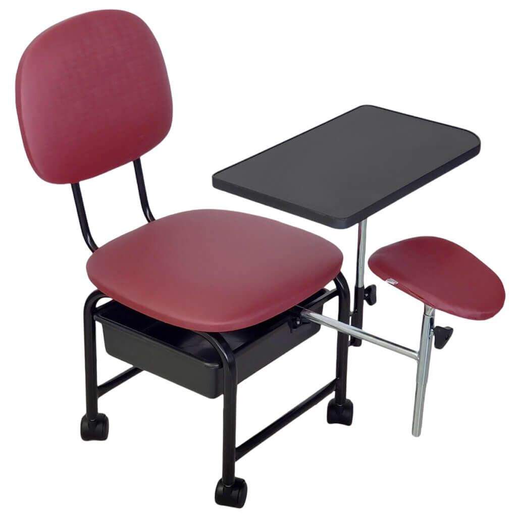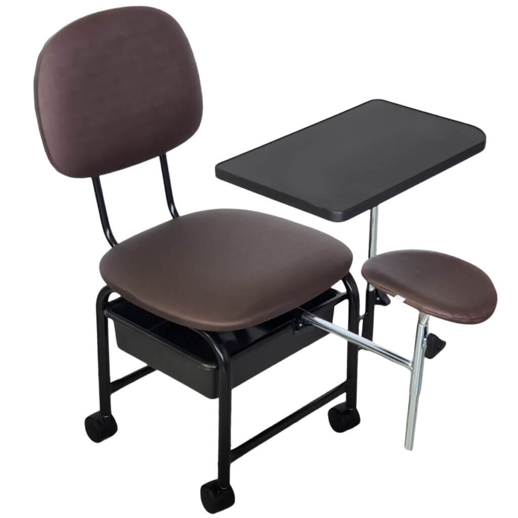 Cadeira giratória especializada para manicures, oferecendo praticidade e conforto durante procedimentos de beleza. Com estrutura metálica robusta e pintura eletrostática, garante máxima durabilidade. Estofamento em tecido Facto resistente ao álcool 70% para fácil higienização. Apoio para pé ajustável (52-69cm) e apoio para mãos articulável proporcionam personalização completa para cada cliente. Rodízios inferiores permitem livre movimentação no ambiente de trabalho.